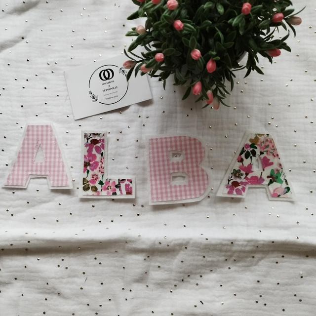Alba, le prénom est en lettre de tissus et feutrine préparer en guirlande.